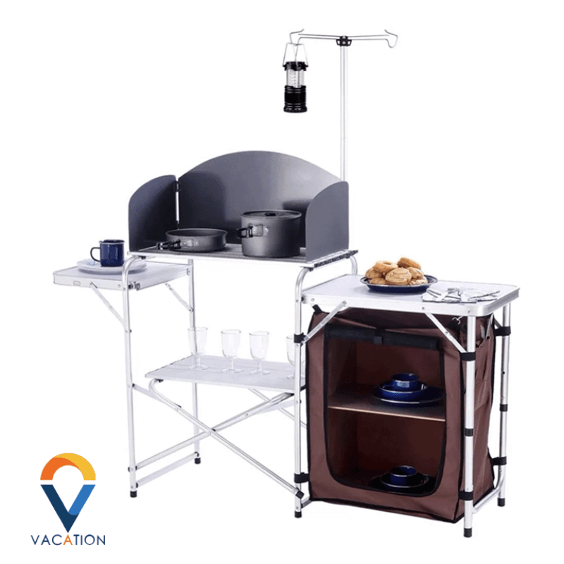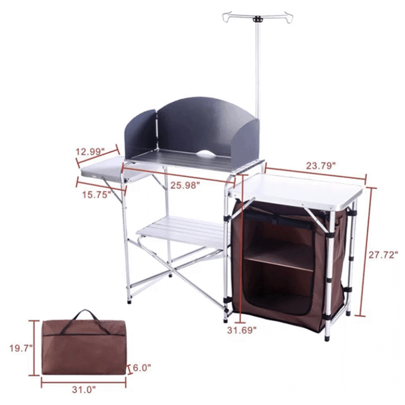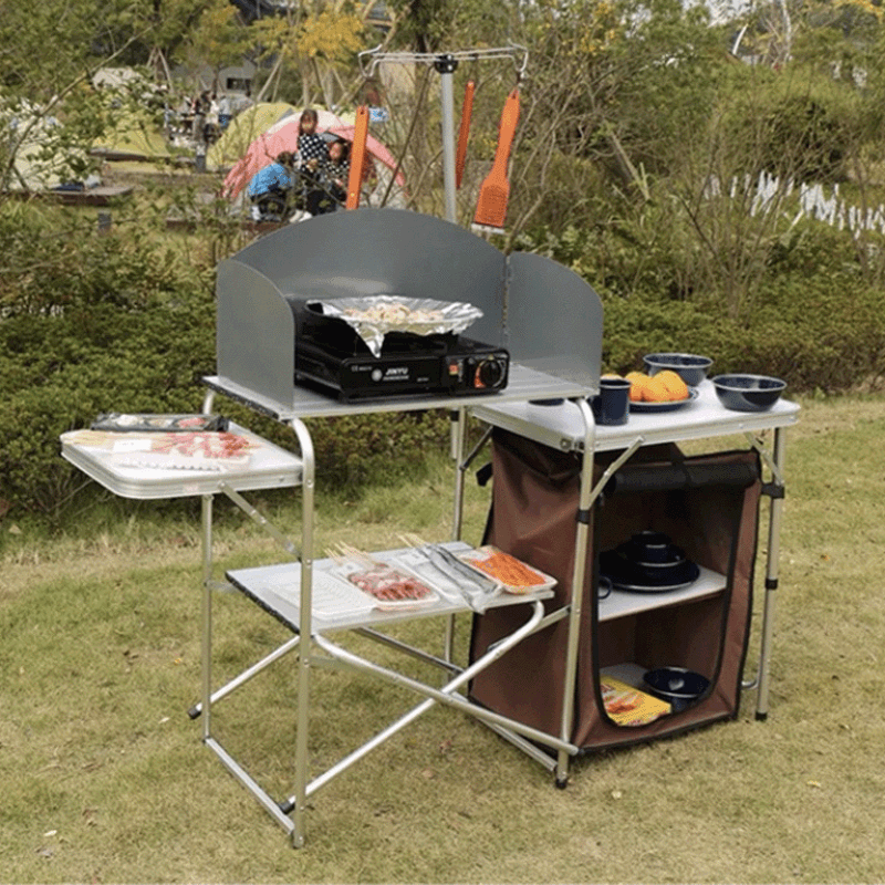 HomeKitchen table for campingKitchen table for campingDescriptionKitchen table for camping - Made of aluminum - Easy to fold and install - Shelves, storage, table for stove, stand for hanging and lighting - Suitable bag included